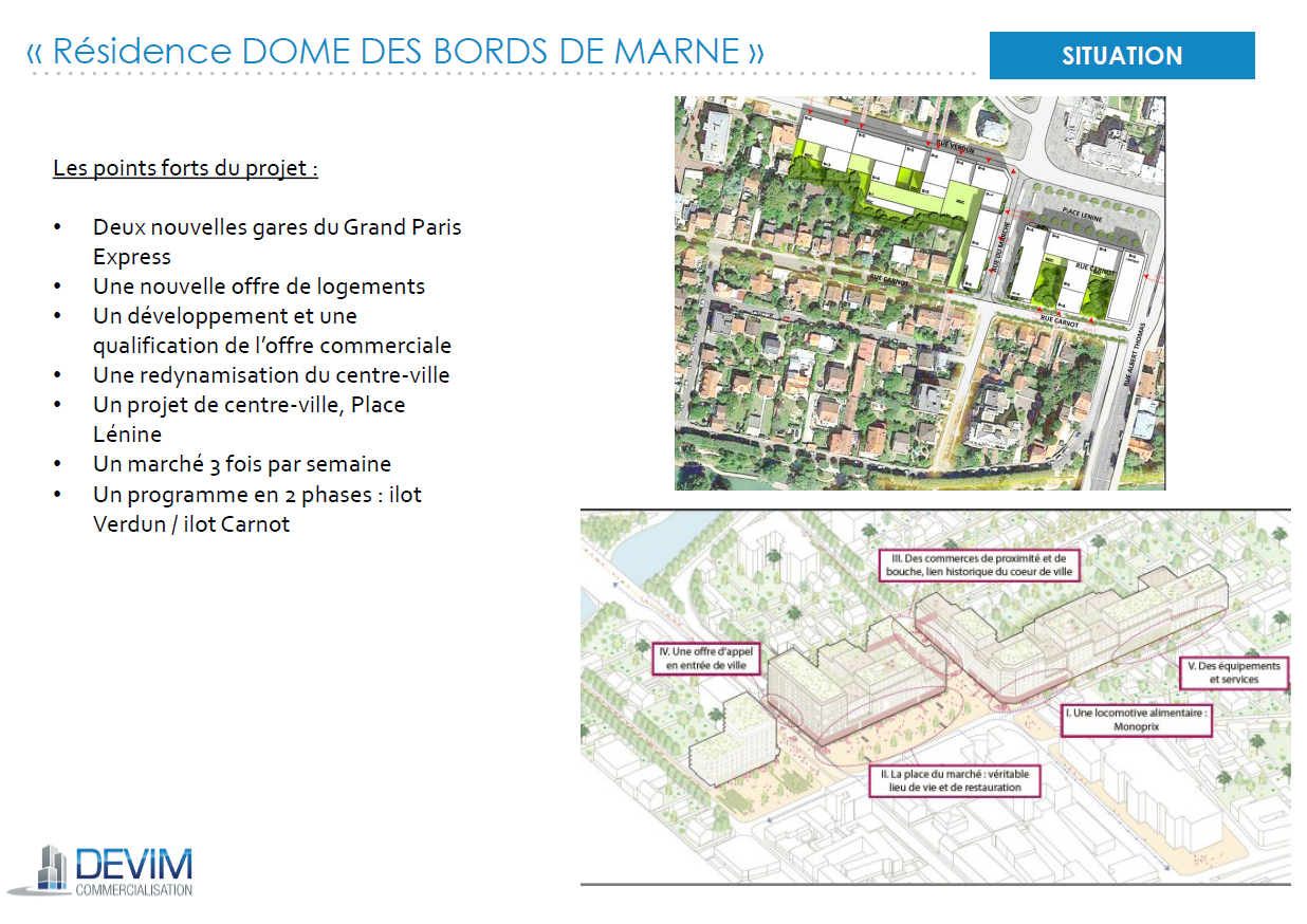 Le programme « Dôme des bords de Marne » est situé à l’entrée de la ville sur les rues de Verdun, du Marché et de l’avenue Carnot (voir plan).